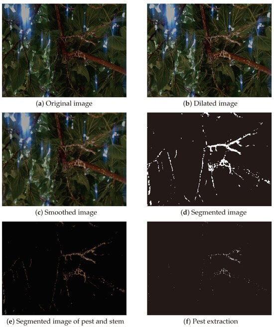 Figure 15a shows the original captured image of the plant and the pest. Figure 15b shows the transformation of the overall image after applying the dilation filter and highlighting the pest. Figure 15c shows the application of the Gaussian blur filter to the resulting image after applying the dilation. Figure 15d shows the application of the HSV filter to the resulting image after applying the Gaussian blur filter, resulting in the segmentation of the image using the HSV color space. The use of the HSV color space is particularly effective in this context as it separates the color information from the intensity information, making it easier to identify the pest. Figure 15e shows the application of the AND Filter Operator to the resulting image after applying the HSV filter. The result is an image highlighting the segmentation of the stem and the embedded pest. Figure 15f shows the separation of the pest, the removal of the brown range, and the binarization of the resulting image. Therefore, for the segmentation of the image, all the pixels that make up the objects belonging to the stem and the pest are obtained using the HSV color filter and thresholding. This method is the most suitable for the treatment of plants, as it allows the elimination of daylight, avoiding false positives. Since these false positives are interpreted as pests in the captured image.