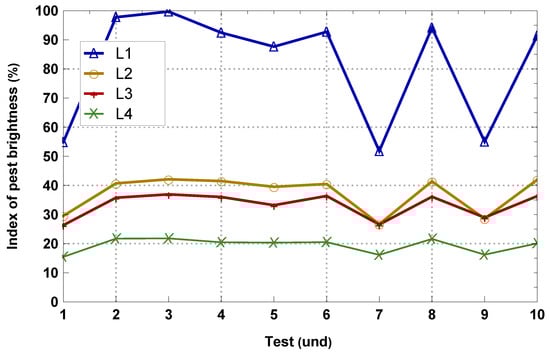 Based on all the results, we conclude that the average luminance condition for image acquisition is set to a value within the range of 36 to 42, with 38 being the most suitable, as the acquisition of images with high luminance produces false positives. Furthermore, the acquisition of images with low luminance allows computer vision techniques for image processing to be used appropriately. On the other hand, the results on image acquisition time show that the better the quality of the captured image, the more pest pixels are detected. However, a lot of time is lost in image processing. Finally, for transporting messages based on the LoRaWAN protocol over the TTN platform, the transmission of messages prior to a connection is very short: 14 ms on average. However, the request and identification procedure increases the connection time.