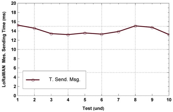 Figure 18 shows the time taken to send messages to the LoRaWAN network in each test. It can be observed that the sending time presents a slight variation for each test performed, giving an average of 14.57 ms, which is within the acceptable range. This result is due to the restrictions of using the LoRaWAN protocol infrastructure, such as the size of the packets to be sent not exceeding 255 bytes and the fact that messages cannot be sent at every instant. Therefore, the processing of the images is resolved at the node, and a representative value is extracted, such as the pest percentage index in the plant, which is approximately 17 bytes. On the other hand, in the transmission of messages by LoRaWAN, data are sent every 5 min for 2 h from the different images stored in the Raspberry Pi, and the message sending time is observed, which is 14.57 ms, as mentioned above.