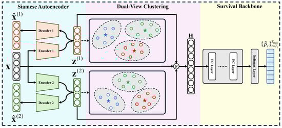 The overall architecture of the DVC-Surv model. The Siamese autoencoder consists of two autoencoders without parameter sharing, mapping patient covariates into latent spaces of two views. Subsequently, the dual-view clustering module integrates the representations from dual views to cluster the samples. Lastly, the fused representation of the two views and covariates is fed into the survival backbone to obtain an estimation of the survival distribution.