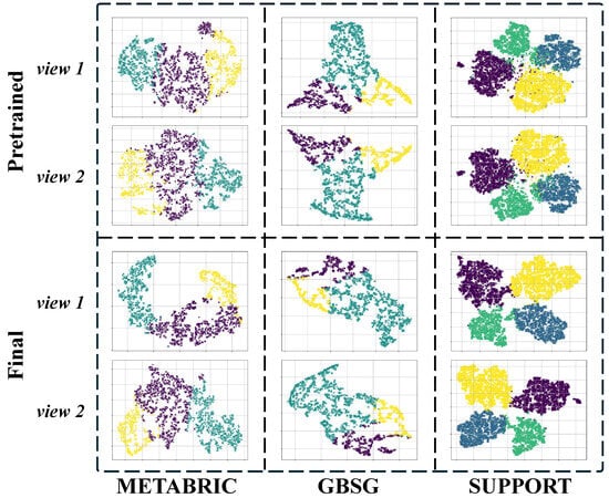 In this study, we integrate multi-view clustering, contrastive learning, and survival analysis to achieve precise patient survival prediction. To further demonstrate the clustering results within the proposed model, a clustering visualization analysis is conducted. Figure 3 presents the dual-view clustering results of the proposed model on three datasets, specifically including the clustering results of two views after the pre-training and training stages. In each figure, different clusters are marked with different colors, while censored and uncensored patients are denoted by ‘×’ and ‘·’, respectively. The tSNE algorithm [47] is utilized for visualization. In practice, we select different K values for different datasets through hyperparameter tuning. The number of latent clusters is set to three in MRTABRIC and GBSG, and to four in SUPPORT. Firstly, based on the visualization results, the two views of the model learned similar yet distinct latent space distributions, thus providing comprehensive complementary information. Secondly, after pre-training, the clustering distribution could be preliminarily initialized, while at the end of training, the clustering information was further fully mined. Lastly, the visualization analysis demonstrates that the proposed model effectively accomplished latent clustering discovery for the survival data.