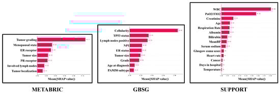 To better explain the basis on which the proposed model makes survival predictions, thereby helping clinicians and patients understand and trust our proposed DVC-Surv model, an interpretability analysis is designed and implemented. Specifically, we employ the SHAP algorithm [48] to analyze the importance of features relied upon during model predictions. Figure 4 presents the feature importance ranking of the proposed model on three datasets. In the METABRIC and GBSG breast cancer datasets, tumor grading and cellularity are considered the most important features, which aligns with existing clinical research. Specifically, existing clinical research indicate that tumor grading and cellularity can reflect the severity of breast cancer patients [49]. Additionally, in the SUPPORT dataset, which targets severely ill hospitalized adults, WBC and PaO2/FiO2 are considered the most important features. Similarly, previous clinical studies confirm that in scenarios such as the ICU, WBC and PaO2/FiO2 can, respectively, reflect the level of inflammation and oxygenation in patients, representing the patient’s condition and thus being closely related to the outcome [50,51]. In summary, the proposed model can accurately identify clinically important factors and make reliable survival predictions.