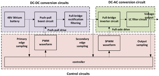 The high-frequency power supply used in this paper is based on a push–pull converter circuit design, and its hardware composition structure is shown in Figure 2, including three parts: the DC–DC converter circuit, the DC–AC converter circuit and the control circuit. A lithium battery with a nominal voltage of 48 V is DC–DC boosted to obtain a high-voltage DC voltage, and then a high-frequency AC voltage is output through a DC–AC converter. In the DC–DC push–pull boost circuit, the two MOSFET tubes in the push–pull circuit are controlled by a pair of complementary PWM (Pulse Width Modulation) waveforms to alternately conduct and output an AC signal, which is then boosted by a transformer and filtered by a full-bridge rectifier. The AC signal is then boosted by a transformer and filtered by a full-bridge rectifier to obtain a high-voltage DC voltage [19,20]. The DC voltage signal obtained in the DC–AC circuit through the SPWM (Sinusoidal PWM) control of the full-bridge inverter circuit is inverted to the required frequency of the high-frequency square wave voltage, and then filtered by the LC filter circuit to obtain a high-frequency sine wave signal.