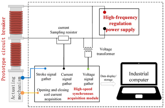 The circuit breaker dynamic capacitance measurement system is arranged as shown in Figure 3, including a high-frequency voltage regulator, a high-speed synchronous acquisition module and an industrial control computer. The high-frequency regulated power supply provides the high-frequency voltage excitation required for the dynamic capacitance measurement of the circuit breaker. The required sampling of the fracture voltage and circuit current signals are of high frequency, so the high-speed synchronous acquisition module is used to achieve accurate and synchronous acquisition of the signals. The acquired signals are transmitted to the industrial control computer for display and data storage.