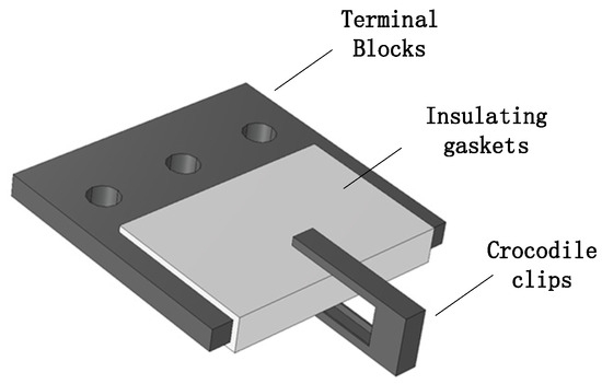 The finite element 3D simulation model of alligator clips and the terminal block is shown in Figure 7. The relative dielectric constant of the silicone rubber is set to 6 [21]. The boundary conditions of the calculation are set as follows: the grounding of the terminal block is 0 potential, and the crocodile clip is 1 V potential. The capacitance between the alligator clips and the terminal block is calculated as C3 = 5.6 pF.