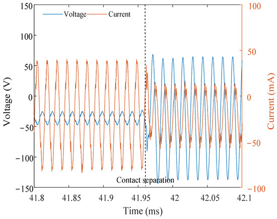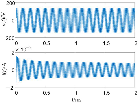 Setting the power supply frequency f = 50 kHz, the sampling frequency is the same as that of the dynamic capacitance test, which is fs = 5 MHz, and the voltage and current waveforms obtained from the simulation are shown in Figure 14.