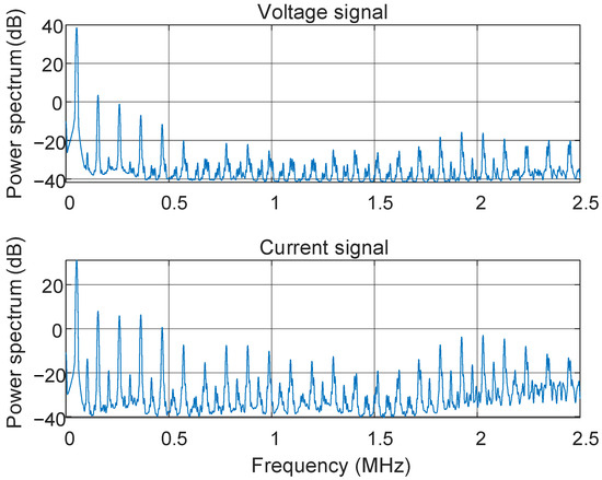The sampling frequency of the dynamic capacitance measurement is set to 5 MHz, and the sampling time is 200 ms. The measured waveforms of voltage and current of the circuit breaker during the breaking process are shown in Figure 8. It can be seen that the current waveform before and after the separation of the contacts have a certain degree of distortion. The voltage waveform before the separation of the contacts also has a small amount of distortion, which is due to the high-frequency power supply in the switching action that will inevitably produce electromagnetic interference. The voltage signal and current signal were FFT (fast fourier transform) calculations; to obtain its spectrum shown in Figure 9, the voltage signal and current signal can be seen there as a series of odd term harmonics. Due to the influence of spectrum leakage, these harmonic components will affect the calculation results in the subsequent extraction of fundamental components; in order to mitigate the impact of harmonics on the subsequent waveform analysis and dynamic capacitance calculation, this paper designs a low-pass filter to filter out these high-frequency harmonic components.