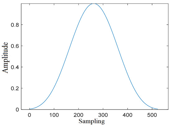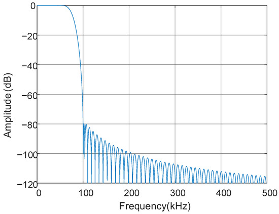 The Finite Impact Response (FIR) low pass filter is designed using the window function method. The fundamental voltage and current frequency is 52 kHz, and the passband frequency can be set to fp = 60 kHz, the stopband frequency to fs = 100 kHz, and the stopband attenuation to 80 dB. According to the desired performance metrics, the window length N is calculated as 523 and β = 7.857. The corresponding kaiser window is shown in Figure 10. The amplitude–frequency response of the obtained FIR low-pass filter is shown in Figure 11.