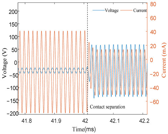 After the low-pass filter to obtain the voltage and current signals, shown in Figure 12, the signal waveform without distortion, the designed filter better filters out the high-frequency harmonic components. As can be seen from the figure, the first weekly voltage and current amplitude after the separation of the contacts change rapidly, indicating that at this time, due to the separation of the contacts, the contact spacing is very small and the capacitance value increases in the spacing of the rapid change. After the first weekly voltage and current amplitude changes slowly, the waveform is similar to a steady state sinusoidal waveform, indicating that the rate of change in capacitance at this time is greatly reduced. It can be seen that the capacitance value changes with the increase in the spacing in the breaking process, and the voltage and current are non-stationary signals, and the magnitude of their fundamental waveform components also changes.