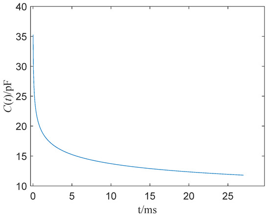 where t is the time, the time range of the simulation t = [0.02, 27] ms, f is the voltage frequency, u(t) is the supply voltage and C(t) is the capacitance value. The constructed capacitance versus time curve is shown in Figure 13. The capacitance has the following characteristics: the capacitance value decreases very rapidly near 0 ms and then levels off.