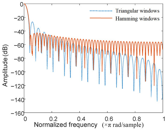 The commonly used window functions for the short-time Fourier transform include the rectangular window, the triangular window, the Kaiser window, the Hamming window, etc. The difference between different window functions mainly lies in the difference between the width of the main flap and the amplitude of the side flap. Different window functions are used to calculate the dynamic capacitance, and other parameters are kept the same. The average error of the calculation and the parameters of the window functions are shown in Table 2. From the data in the table, it can be found that the Blackman and Chebyshev windows with wider main flap widths, but smaller side flap amplitudes have larger errors, which indicates that the large main flap widths lead to insufficient frequency resolution, and the spectral information of the fundamental waveforms cannot be calculated correctly. The average errors of the rectangular, triangular, Kaiser, and Hamming windows are close to each other, with the triangular window having a smaller average error. Compared with the rectangular window and the Kaiser window, the triangular window has a relatively wide main plate and a lower sidelobe, and its lowest error indicates that the frequency resolution corresponding to the width of the main plate can meet the requirements, and then the lower sidelobe amplitude leads to lower computational error. The Hamming window has the same width of the main plate and lower sidelobe amplitude as the triangular window, but by comparing the two spectrograms (Figure 15), we can find that the Hamming window has the same width of the main plate and the same sidelobe amplitude as the triangular window, and the Hamming window has the same width of the main plate and the same sidelobe amplitude. The maximum value of the Hamming window is smaller than that of the triangular window, but the decay rate of its parameter amplitude with frequency is very small, and the amplitude of the triangular window is smaller than that of the Hamming window when the normalised frequency is greater than 0.2. Therefore, when using the Hamming window, the computational error caused by the high-frequency component is larger than that of the triangular window. Subsequent dynamic capacitance calculations were performed using the triangular window function with a smaller computational error.