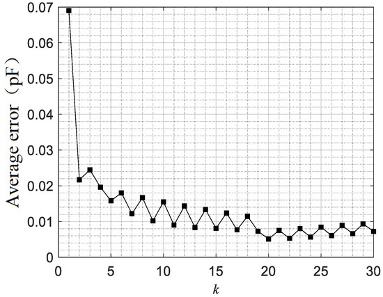 where k is a positive integer and f0 is the frequency of the signal component to be analysed. Changing the value of k in Equation (17) so that the length of the window function increases by an integer multiple, the average error of the dynamic capacitance calculation is obtained as shown in Figure 16. As k increases, the average error gradually decreases and then tends to be stable. An increase in the value of k improves the frequency resolution, but at the same time, it will also cause the computational volume to rise, according to the FFT theory, the computational time complexity of the algorithm will rise from Nlog2 N to kNlog2 (kN). When k is greater than 5, the average error decline rate has been smaller, taking into account the calculation error and calculation time, k = 5 is selected for dynamic capacitance calculation, at which time the length of the window function is 96 × 5 = 480.