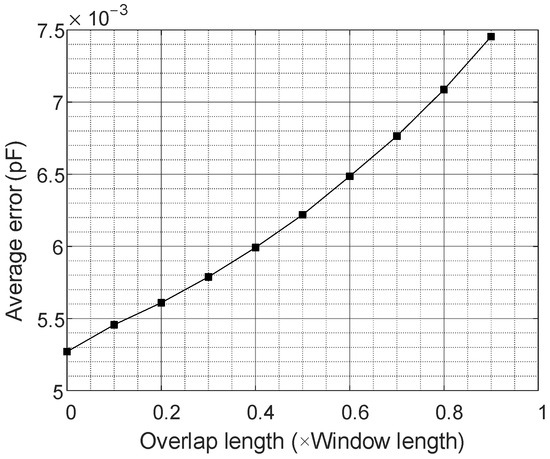 The variation in the average error of the dynamic capacitance calculation obtained by making the overlap length of neighbouring windows gradually increment from 0.1 times of the window length to 0.9 times is shown in Figure 17. As the overlap length increases, the computational error gradually increases. The overlap length exists to make the calculation results smoother in the time domain, but because the sampling frequency used in this paper is high enough that even if the overlap length is 0, it will not cause discontinuity in time, and the increase in the overlap length will also lead to an increase in the amount of computation; therefore, the overlap length in the dynamic capacitance calculation in this paper will be set to zero.