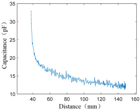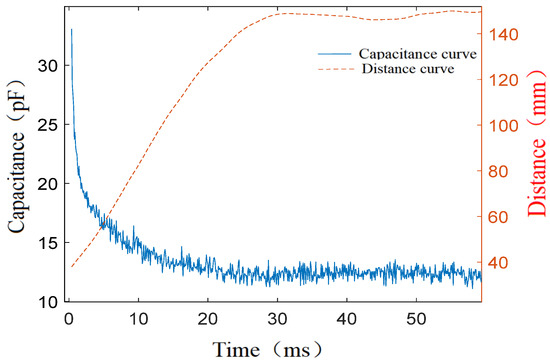 The experimentally obtained dynamic capacitance-time curve is shown in Figure 18. Due to the dispersion of the oscilloscope triggering time and the action time of the circuit breaker operating mechanism during each measurement, in order to facilitate the subsequent comparative analysis, the horizontal axis of the dynamic capacitance-time curve is replaced by the stroke from the time, i.e., the capacitance change with the stroke of the contact in the tripping process is obtained. The curve is shown in Figure 19. The starting point of the dynamic capacitance-stroke curve is the arc contact separation point, and the stroke value is 37.97mm. According to the circuit breaker exit report, the maximum stroke of the circuit breaker is 150 mm, and the arc contact opening distance of the circuit breaker is 150-37.97 = 112.03mm, which is consistent with the result of the arc contact opening distance of 112 mm in the factory inspection report.