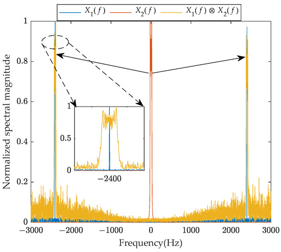 where F { . } denotes the Fourier transform, represents the convolution symbol, z ( t ) is the squared signal, whose spectrum is composed of convolutions of X 1 ( f ) and X 2 ( f ) . As the baseband data alternate between 0 and 1, adjacent bits induce periodic ±   π phase shifts in the squared signal, resulting in two peak spectral lines to appear on either side of the center frequency 2 f in the spectrum X 1 ( f ) of the squared signal, with a frequency spacing equal to the symbol rate. X 2 ( f ) denotes the spectrum of the linear chirp function.