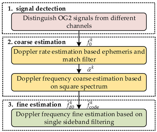 The overall processing flow of the method performed to precisely estimate the Doppler frequency using Equation (3) is illustrated in Figure 3. Specifically, detecting the presence of SOP is the first step in positioning, which aims to identify the channel of the ORCOMM downlink signal. Subsequently, a “coarse + fine” processing approach is applied to measure the frequency of the OG2 signal after separating the Doppler rate.