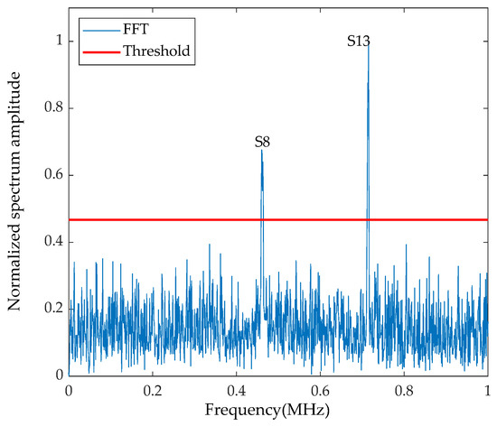 where f left k max and f right k max represent the frequencies corresponding to the left and right peak spectral lines of the squared spectrum. At this point, the frequency corresponding to the center position of the left and right peak spectral lines is twice that of f d 0 k (refer to Equation (2) and Figure 2 for details).