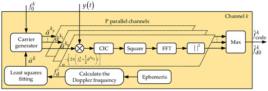 where Φ ( . ) represents the energy of the two peak spectral lines in Equation (2) after removing the Doppler rate, α k represents the estimated Doppler rate of the k-channel signal calculated from Equation (8), and Δ α represents the search resolution of Doppler rate. Let k max denote the channel with the highest energy among the p + 1 channels. According to Equation (11), the coarse Doppler frequency estimate f d 0 k and the code rate estimate f code k for the channel k can be obtained.