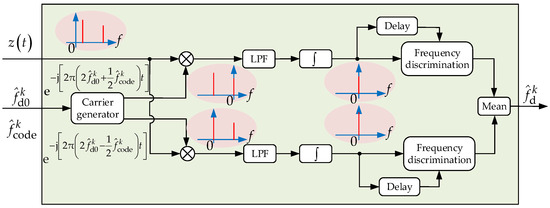 Step 6: The frequency discrimination results, Δ f d left k ( q ) and Δ f d right k ( q ) , are substituted into Equation (17) to obtain the Doppler frequency estimation residual.