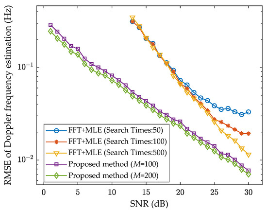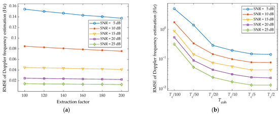 As shown in Figure 7a, under low SNR conditions, selecting a larger extraction factor improves the noise resistance of the proposed method and noticeably improves the frequency estimation performance. Figure 7b demonstrates that when the delay time exceeds T c / 5 , the accuracy of the Doppler frequency estimation remains nearly unchanged as the delay time continues to increase.