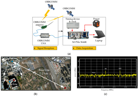 Figure 9. Experimental scenarios and conditions. (a) Hardware acquisition platform and data acquisition process; (b) experimental scenario (the red and blue dots represent the user and reference stations, respectively); (c) real-time spectrum.