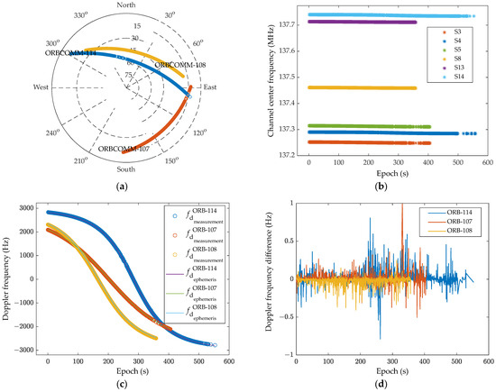 Figure 10. Doppler measurement results. (a) Sky plot of visible satellites; (b) measured center frequencies of different channel signals at the user station; (c) measured Doppler frequencies and ephemeris estimated Doppler frequencies at the user station; (d) difference in measured Doppler frequency values between the user station and reference station receivers.
