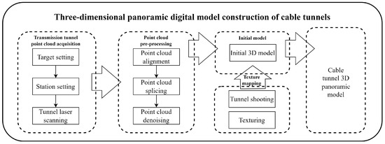 The overall technical route for the 3D panoramic digital modeling of the cable tunnel is presented in Figure 1, consisting of three key steps: (1) 3D Data Acquisition: Terrestrial laser scanning (TLS) technology is employed to collect complete point cloud data of the transmission tunnel by placing targets and setting up multiple scanning stations in the tunnel. (2) Point Cloud Pre-processing: The point cloud data from each station are pre-processed through alignment, stitching, denoising, and other techniques. (3) Tunnel Digital Modeling: The initial 3D model is established based on the processed point cloud data using modeling software. Subsequently, photographs of the tunnels, cables, and ancillary equipment are taken with a digital camera, followed by texture creation and mapping onto the model.