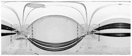 In this study, a FARO S350 3D laser scanner is utilized to acquire the point cloud data of the tunnel. Since cable tunnels usually extend from hundreds to thousands of meters, and given the limitations of the scanner’s accuracy, as well as the tunnel’s layout, multiple scanning stations are required. To ensure the proper alignment and splicing of the point cloud, overlapping scanning areas are necessary between adjacent stations, and targets are placed within a specified range in front of and behind each scanner, respectively. Once the scanning process is completed, a panoramic depth image is generated, as shown in Figure 2.