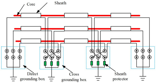 where represents the current in the cross-interconnection grounding point and the sheath current of a single-circuit cross-interconnection cable can be calculated according to Equations (1)–(7). The sheath currents of multi-circuit cables can be calculated by expanding the matrix of Equations (5)–(7).