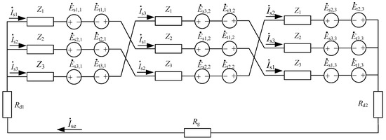 Due to the existence of electromagnetic induction between metal conductors, when there is a current flowing in the cable core, a current will be induced in the metal sheath, and the induced electromotive force on the sheath will be generated by the core current together with the sheath current. According to the definition of the cross-interconnection grounding method, the equivalent circuit diagram of the cable cross-interconnection system is shown in Figure 5. are the impedance of each small segment of the sheath, respectively, is the induced electromotive force generated by the sheath current, and is the induced electromotive force generated by the core current. are the sheath current of each single cable, respectively, and are the grounding resistance.