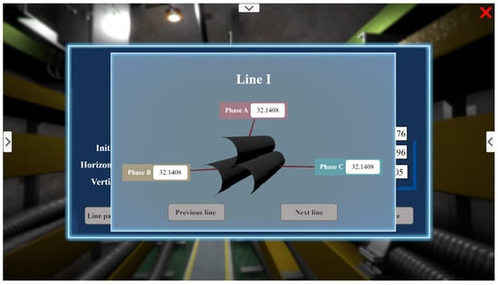 Figure 6 illustrates the integration of the simulation model and the panoramic digital model. The sheath current can be calculated online with the developed visualization system and the simulation results can be demonstrated via the 3D model, as shown in Figure 7. A dedicated data reading interface for the High-voltage Cable Lean Management Platform (HCLMP) was designed within the developed 3D panoramic system. The input parameters of the simulation model, such as the voltage level, circuit load, operating frequency, etc., of the cables, can be accessed directly from the HCLMP. Other input parameters of the simulation model, such as the spatial information of the cables (e.g., line spacing) and electrical information of the cables (e.g., sheath inner/outer diameter), are stored in the database of the developed system and can be invoked by the simulation model directly.