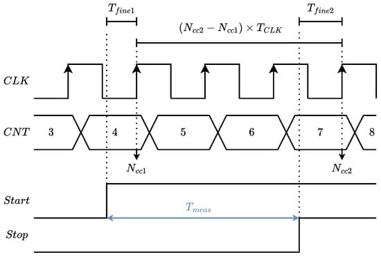 Referring to Equation (1), it is evident that the resolution (LSB) of the TDL TDC is , the quantization noise (i.e., ) [,] (the digitization process introduces a quantization error ranging between and , with a uniform distribution characterized by a variance of , thereby defining the measurement precision), and the Full-Scale Range (FSR) . Therefore, in the presence of jitter (i.e., ) between the START and STOP signals, due to electronic system noise, the measurement precision (i.e., ) of the measured time interval (i.e., results []: