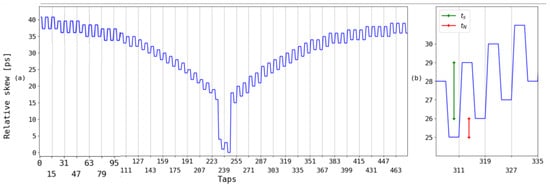 These figures must, however, be taken into account in light of the TDL, particularly with regard to the tap (C or O) propagation delay (i.e., with ). Indeed, in cases when the tap propagation delay falls short of , we can run into skew-induced BEs. More logically, because there is a non-negligible amount of skew, the output code is compiled “progressively” rather than “simultaneously”. In general, if the tap propagation delay is less than the skew between two sampling DFFs, it is possible that the values, which propagate asynchronously, will skip a few taps, as illustrated graphically in Figure 7, where represents the CARRY8 outputs (i.e., the D pins of the DFFs), represents the C pins of the DFFs, and the tap propagation delays are represented by :