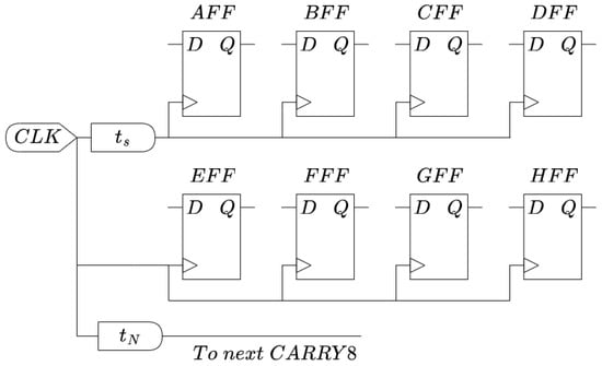 This allows us to model the clock distribution network of the CARRY8 primitive (Figure 6). To put it numerically, as also shown previously in Figure 5, the and values are below a few ps, e.g., ps and ps.