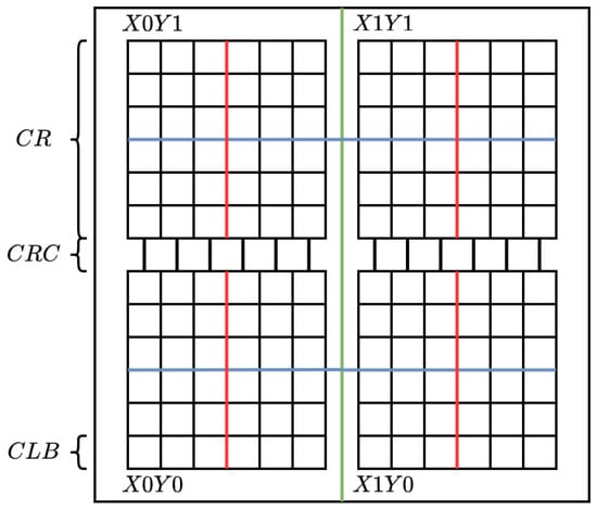 Schematic view of a generic Xilinx FPGA, subdivided into CRs (i.e., X0Y0, X0Y1, X1Y0, and X1Y1) spaced by CRC. The connection in between the clock region is shown, as well as the clock distribution network from the backbone (green) to the horizontal lines (violet) to the inter-clock region routing (red).