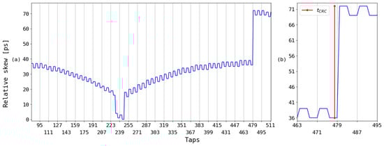Clock skew pattern along two CRs (i.e., the CRC is between tap 479 and 480), with (a) showing the overall trend and (b) showing the sudden increase in clock skew ().