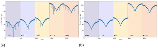 Clock skew pattern along many CRs with TDC firmware (a) and without (b).