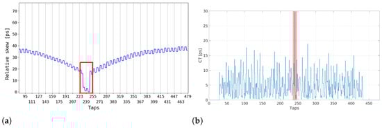 Once the vertical length and placing has been addressed, there may be some factors to take into account while determining its precise horizontal placement. The FPGA does, in fact, display a non-uniform structure, cycling between CLB, RAM, and DSP columns. In this regard, referring to the discontinuities at taps 223–255 in Figure 5 and Figure 9, we can observe the presence of an ultra-bin in the same position (i.e., tap 241) of the CT (Figure 11) (for this reason, we attributed the skew to the interaction between the firmware and the non-uniform structure of the FPGA, and we hypothesize that the highlighted skew is the cause of the ultra-bin). Since such discontinuities are too temporally close, any TDL that excludes them would result in a that would be too small, and, therefore, physically could not be implemented.