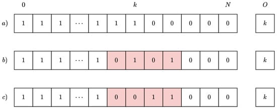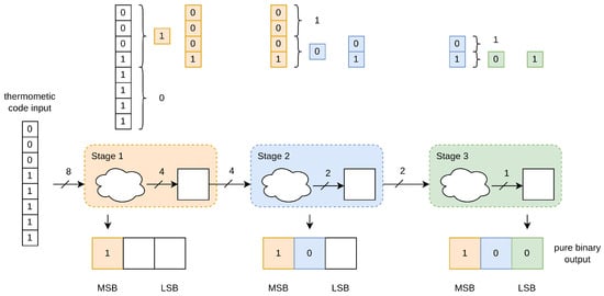 The stages, in the case of Log2 decoders, are generally characterized by inputs and outputs (i.e., inputs and outputs in this implementation), which propagate the portion of the TDL where the most significant 1–0 transition occurs in the next stage. So, during the propagation the pure binary output is compiled from the most significant bit to the least significant bit, resembling a successive-approximation register. In Figure 15, an example is shown, with (i.e., ):