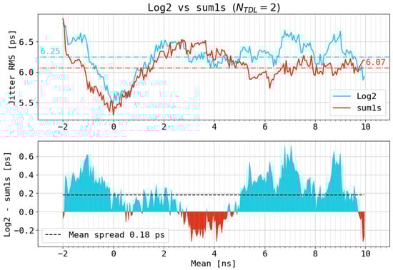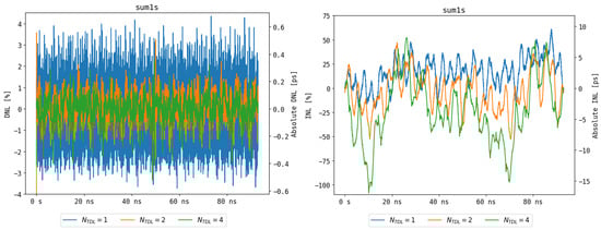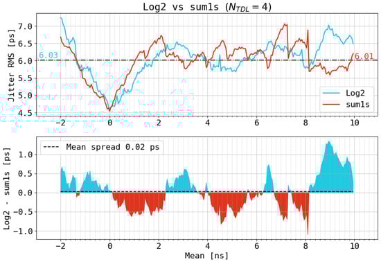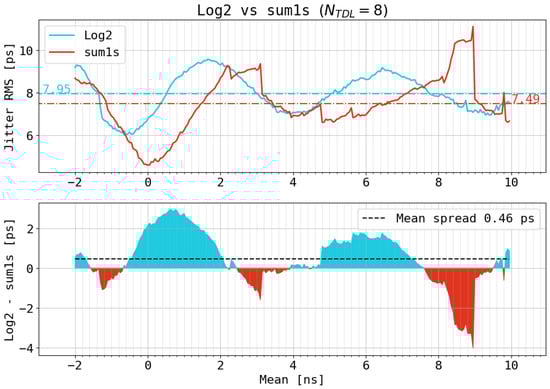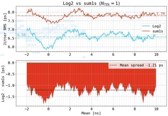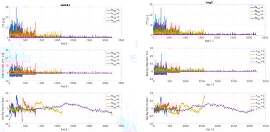 Considering the fact that PVT fluctuatuons can be compensated by calibration, the main criticality in TDL TDC is the Bubble Error (BE) [,,,], which is a switching effect in the thermometer code’s uniform pattern. Instead of the output being a continuous string of high levels followed by zeros, which is typical of a proper thermometer code, the DFFs and their connections have non-idealities and mismatches that could cause irregularities (i.e., one or more zeros that show up as bubbles in the continuity of ones). For example, in an 8-tap-long TDL, the output might be “11111010” rather than “11111110”. BEs result from deterministic non-linearities in TDL propagation (e.g., skews) [] or from stochastic processes (e.g., sampling mistakes due to setup and hold time violations) []. The presence of BEs strongly impacts the output of the thermometer-to-binary converter, reducing the resolution, precision, and linearity. Moreover, the behavior of the pure binary output is also influenced by the architecture of the decoder. If the “sum1s” approach is used, the BEs are compressed (e.g., “11111010” is interpreted as “11111100”), while the “Log2” method neglects the presence of bubbles (e.g., “11111010” is interpreted as “11111110”). Due to these opposite behaviors, “sum1s” and “Log2” are also known as “bubble compression” or “ones-counter” [] and “one-hot” algorithms [], respectively.