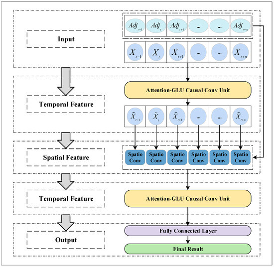 In this section, the overall flow of the proposed AG-STCN model is presented. Specifically, the AG-STCN model consists of multiple attention spatio-temporal convolution modules, and each attention spatio-temporal convolution module consists of two parts: a spatial convolution unit and two attention-gated linear causal convolution units. The spatial convolution unit integrates attention-guided soft pruning operations and GCN-based spatial convolution; and the attention-gated linear causal convolution unit integrates causal convolution, a GLU, and self-attention. The processing of a single attention spatio-temporal convolution module is shown in Figure 2. Taking the spatio-temporal graph G as input, the spatial convolution unit will reassign the weights of the edges between nodes to the static graphs in each time unit, and carry out graph convolution operations to realize the capturing of spatial features; the two attention-gated linear causal convolution units realize the capturing of temporal features and the integration of spatio-temporal features, respectively; and the fully-connected layer obtains final results through the integration of spatio-temporal features and the integration of temporal features. The final result is obtained by the fully connected layer through the integrated spatio-temporal features.