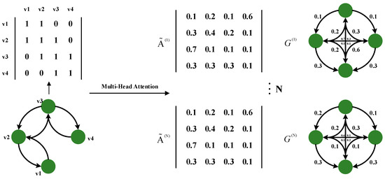 where Q and K are derived from the node feature matrices, and are the parameter matrices, and corresponds to the adjacency matrix generated by the t-th attention head in the multi-head attention. First, Q and K are linearly transformed by their respective weight matrices and to obtain a new representation. Subsequently, the dot product between the transformed Q and K is computed to evaluate the correlation between the nodes. Next, the dot product results are normalized using the softmax function such that the sum of the elements in each row is 1, resulting in the attention score matrix .