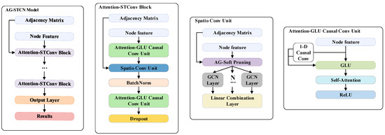 The detailed structure of the AG-STCN, including the Attention Spatio-Temporal Convolutional block, is shown in Figure 4. The Attention Spatio-Temporal Convolutional block consists of two components: the Spatial Convolutional Unit and the Attention-Gated Linear Causal Convolutional Units. This will be elaborated below.
