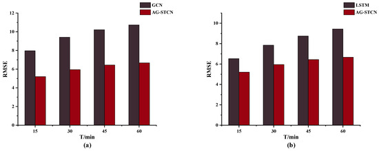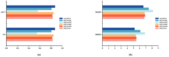 Figure 10 illustrates the change in performance metrics for each variant model across both tasks, showing that the complete AG-STCN achieves the best results for all metrics. Removing any component results in performance degradation. The following conclusions are drawn from the experimental results: