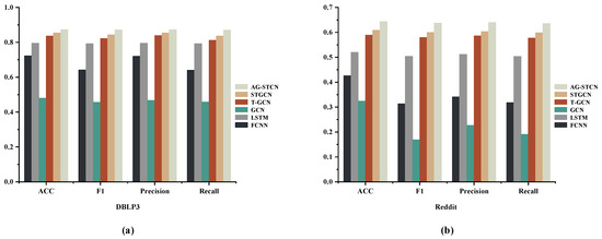 This advantage is particularly evident in spatio-temporal graph node classification tasks. For instance, on the DBLP-3 dataset, the AG-STCN improves the MacroF1 metric by 6.02% and 3.35% compared to the T-GCN and STGCN, respectively. These results highlight the AG-STCN’s superior capability to capture complex spatial dependencies and its effectiveness in spatio-temporal data analysis.