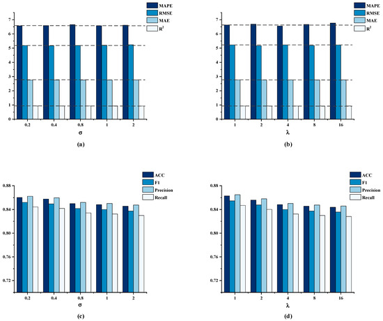 Noise is a common challenge in real-world data collection. To evaluate the noise resistance of the AG-STCN model, perturbation analysis experiments were conducted for two tasks: traffic prediction and spatio-temporal graph node classification. For the classification task, the DBLP-3 dataset was used, while the dataset described in Section 4.1 was used for traffic prediction with a 15 min prediction scale. During the experiment, two types of random noise were added to the data: Gaussian noise with parameter where and Poisson noise with parameter where , with noise values subsequently normalized to [0, 1]. The results are presented in Figure 11. Figure 11a,c show the results of adding Gaussian noise for traffic prediction and classification, respectively, with σ on the horizontal axis and changes in evaluation metrics on the vertical axis. Different colors represent different metrics. Similarly, Figure 11b,d show the results of adding Poisson noise with parameter .
