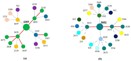 To further understand the interpretability of the AG-STCN, we visualize the attention values of different neighboring nodes after soft pruning. The results for two nodes (node 4305 and node 3052) from the Reddit dataset are shown in Figure 12. Different node colors represent different node categories. The red solid line and gray dashed line represent higher and lower attention values, respectively. The data in Figure 12 show that the target node is more affected by like neighboring nodes of the same category. This is because nodes of the same category play similar roles in the graph. For example, for node 4305, its direct neighbors with higher attention values are node 3650 and node 2895, which both belong to the social science category of posts, and similar observations can be observed for node 3052. This verifies that the AG-STCN is able to dynamically detect important task-related nodes based on attention-guided soft pruning operations.