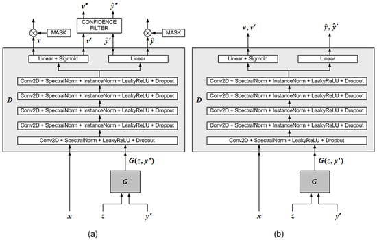 where , , and denote functions that return the sum, the maximum component, and the length of the input vector, respectively. In Equation (20), when , is set to a larger value than when . According to Equation (20), if there are many 0’s in , the masking ratio increases, and the learning rate of the discriminator decreases, so that learning progresses slowly, while if there are many 1’s in , the masking ratio decreases, and the learning rate of the discriminator increases, so that learning progresses quickly. Therefore, by adaptively changing the masking ratio of the discriminator according to Equation (20), which is designed based on the analysis of [54], the learning of the discriminator and generator can be made more stable so that the discriminator can have more stable classification performance.