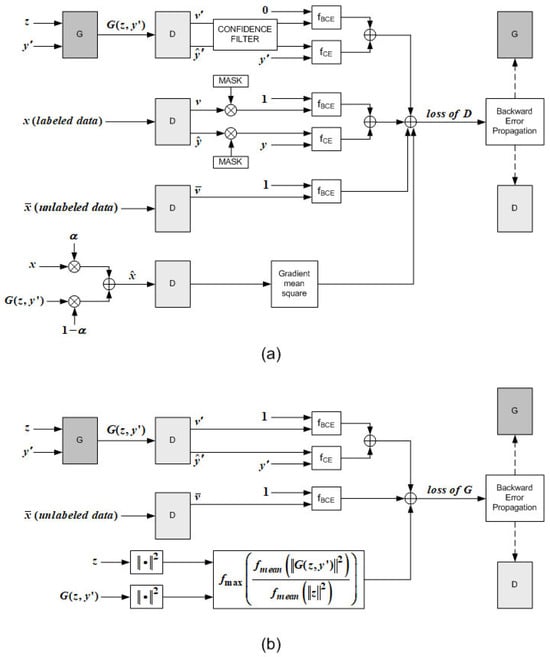 For a few years, research on few-shot GAN [20,21,22,23,24] and data-efficient GAN [25,26,27,28,29,30] has been receiving a lot of attention, which aims to generate high-quality images with a small quantity of data. As a result of these studies, data augmentation [25,28,30], modulation-based methods [22], regularization methods [23], masking techniques [28,29,30], and lottery ticket techniques [30] were developed. However, most of those methods and techniques focus on improving the quality and generalization of the images created by the generator in situations with limited labeled training data, rather than improving the classification performance of the discriminator.