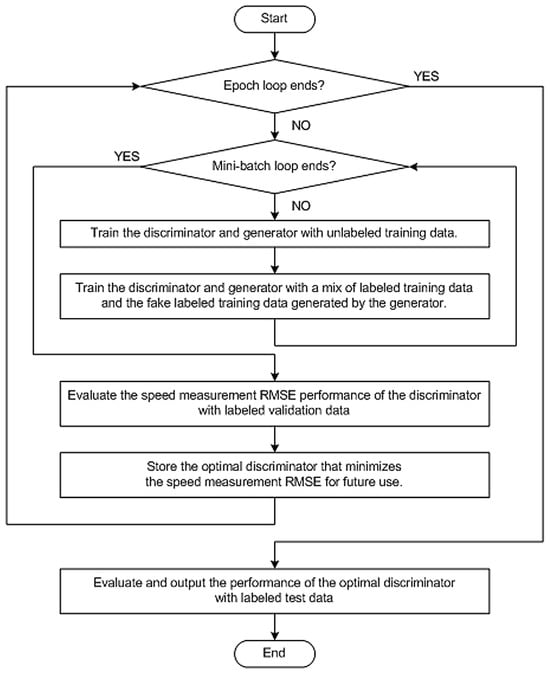 Figure 3 shows the training and validating processes of SM-ACGAN. In the training process, there is an epoch loop that repeats times. In the epoch loop, a mini-batch loop is executed that evaluates the performance of SM-ACGAN. If unlabeled training data are given, those are divided by to form data groups of unlabeled training data. With those data groups, the mini-batch loop repeats times. Then, labeled fake training data are generated by the generator and mixed with real labeled training data to make mixed labeled training data. Those data are divided by to form data groups of labeled training data. With those data groups, the mini-batch loop repeats times. We computed the losses of neural networks in mini-batch units. In each mini-batch loop, we performed the process of backward error propagation by applying the backward function of Pytorch. Then, we updated the weights of the neural network based on the stochastic gradient decent (SGD) algorithm [47] by calling the step function of the optimizer object [56,57] in Pytorch. For the scheduler, we used the object of Pytorch. We set the step size and the gamma to 1 and 0.5, respectively. After the training process, the validating process followed, which was performed using labeled training data. Although omitted in Figure 3, the validating process also included a mini-batch loop, which evaluated the classification performance of the trained discriminator. The mini-batch loop in the validating process repeats times. After all iterations of the epoch loop are completed, the optimal discriminant that minimizes the speed measurement RMSE is stored for future use. The last part of Figure 3 shows the process of evaluating the optimal discriminator with labeled test data. The performance of the optimal discriminator evaluated on labeled test data corresponds to its actual performance when applied to real tasks.